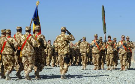 Romanian soldiers of the outgoing 2nd battalion, salute their replacements, the 300th, in a transfer of authority ceremony at Forward Operating Base Apache, Zabul province.