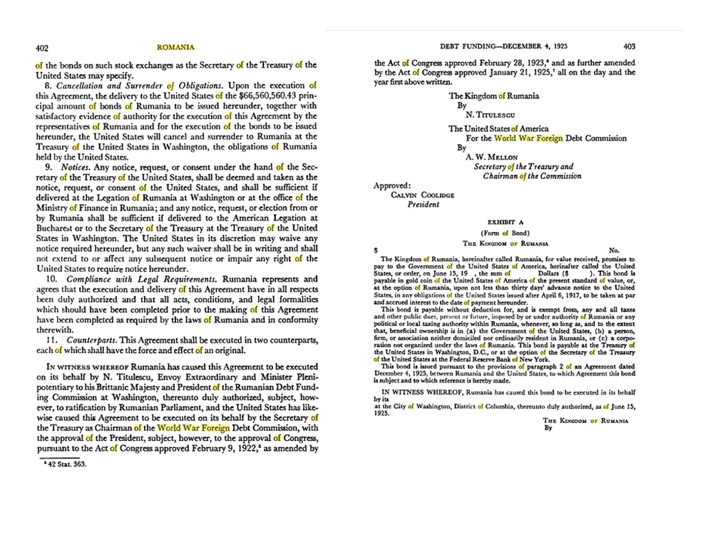 It is not well known nor mentioned in a number of recent historial works on Romania, that the U.S. provided war loans to the US during the War. These amounted to $36 million (equal to about $500 million in today's terms). Repayment requested by the U.S. was negotiated in 1925 by Nicolae Titulescu.