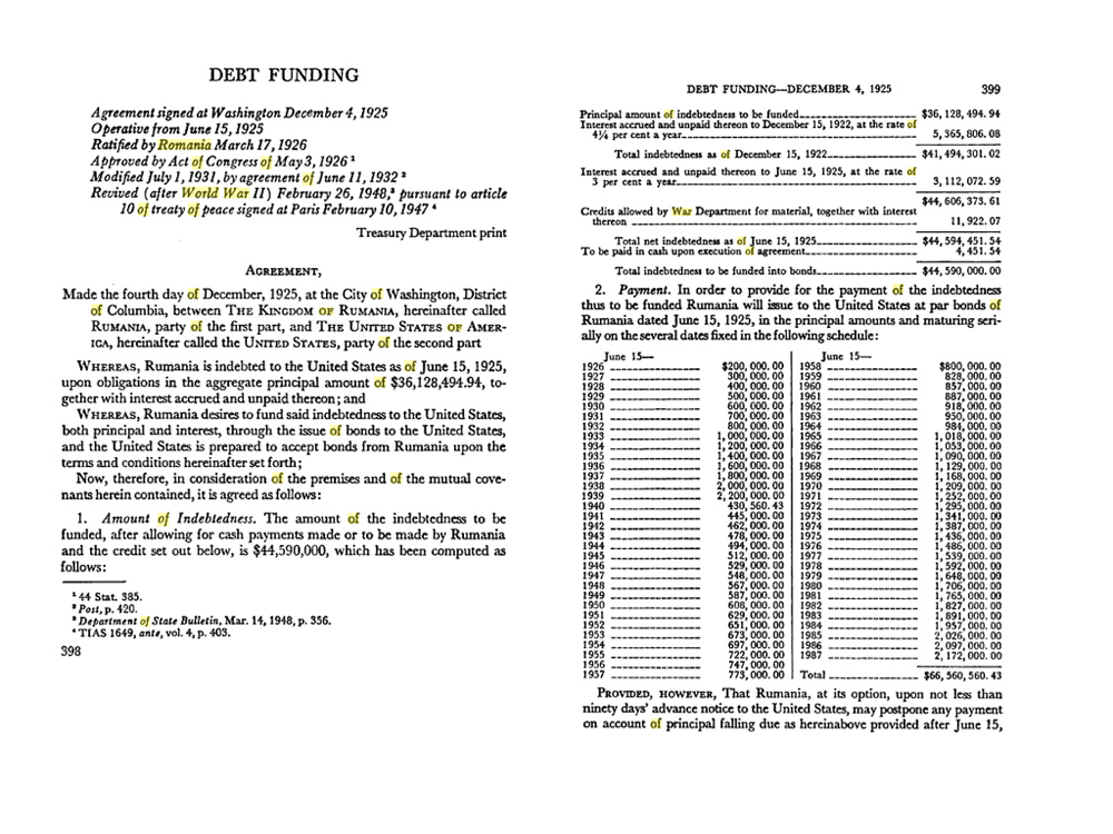 It is not well known nor mentioned in a number of recent historial works on Romania, that the U.S. provided war loans to the US during the War. These amounted to $36 million (equal to about $500 million in today's terms). Repayment requested by the U.S. was negotiated in 1925 by Nicolae Titulescu.